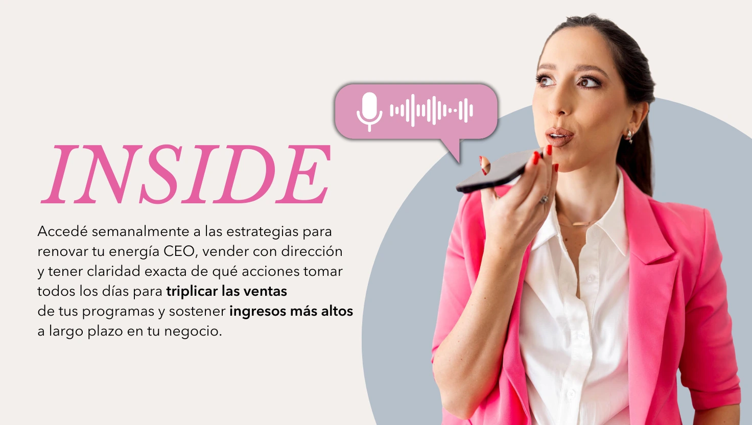 Cada semana recibís dos entrenamientos en audio que te ayudan a desbloquear lo que ya superaste, recalibrar tu dirección y tomar decisiones estratégicas para vender más y disfrutar tu negocio otra vez.